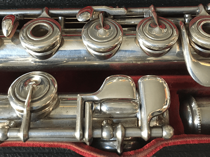 Just for comparison purpose, below 1939 Haynes has the tell-tale signs of handmade instrument – French pointed arms, as well as soldered tone holes. For those not too familiar with flutes, the foot joint on the above instrument has three parallel keys (all together four keys) for the right hand pinky to work while the picture below has only two parallel (total three keys). The flute above has a B-foot while the one below is C-foot.
